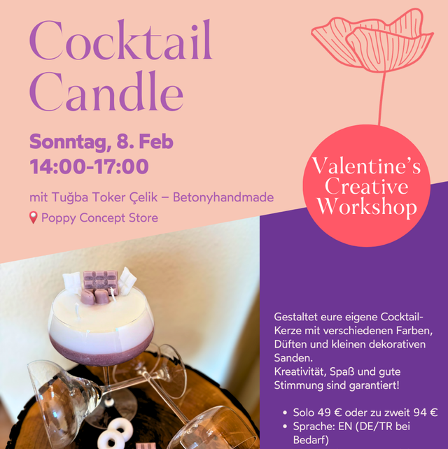 In unserem Cocktail Candle Workshop gestaltest du deine ganz persönliche Cocktail-Kerze – inspiriert von sommerlichen Drinks, verspielten Farben und feinen Details.